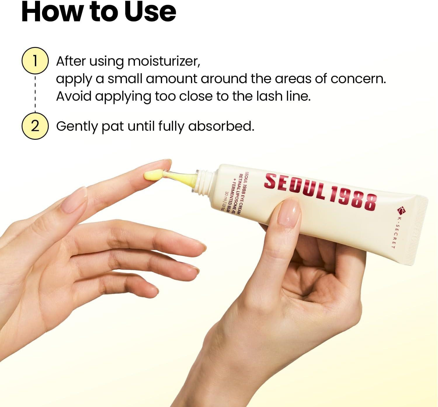 Retinal liposome 4% eye cream with fermented bean for intensive eye zone care. Retinal liposome and fermented bean help with wrinkle and pigmentation care for smooth and firm skin. Awaken tired eyes and restore youthful radiance with Seoul 1988 Revitalizing Eye Cream, a premium Korean skincare solution crafted to hydrate, smooth, and brighten the delicate under-eye area. Inspired by the timeless beauty secrets of Seoul and powered by modern K-beauty innovation, this luxurious eye cream is your daily defense against puffiness, fine lines, and dark circles. ✨ Why Seoul 1988? Born from the legacy of Korea’s skincare excellence, Seoul 1988 Eye Cream combines tradition and technology to deliver results you can see and feel. Gentle enough for daily use and effective enough for visible transformation, it’s ideal for all skin types, including sensitive skin.